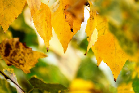 Blurred image of branch with yellow autumn leaves, lit by the sun, fall season close up.