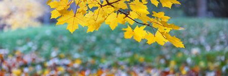 Yellow maple leaves in autumn season with blue blurred background. Colorful bright foliage in the autumn park. Autumn leaves background.