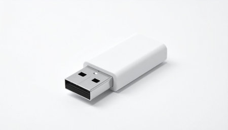 A single, modern USB drive rests on a clean, white surface, its sharp shadow hinting at the importance of the digital information it holds.