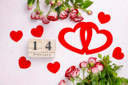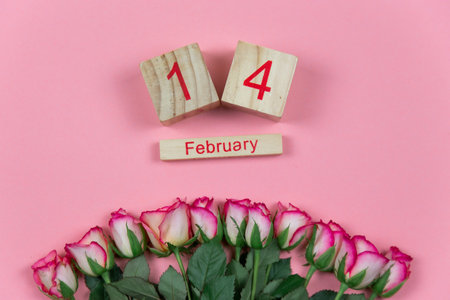 Wooden calendar on February 14 with roses and heart. happy valentines day concept