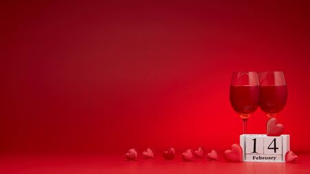 Still life with silk hearts, two glasses with wine, calendar with date 14 february on red background. Valentine's Day card with copy space. Design element for romantic greeting card, invitation