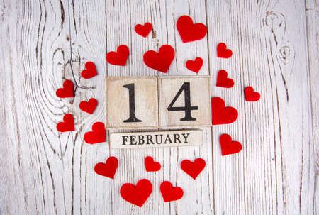 wooden calendar show of February 14 with red and white heart for valentine day background