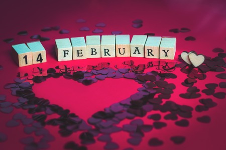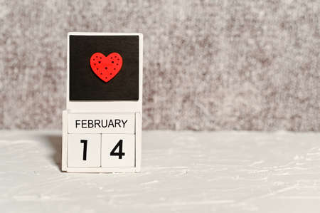 Wooden cubes with the date of February 14 and heart in the center. Valentine's Day celebration