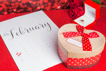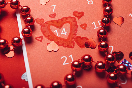 Calendar with 14th of February date. Planning Valentines day holiday. Love romantic dating. Preparing with hearts. Candles romance