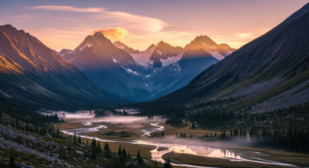 A breathtaking sunset illuminates the mountains and a winding river, capturing the beauty of nature in a serene landscape filled with tranquility.