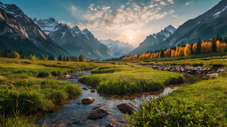 Mountain landscape with a small river and green meadows at sunset