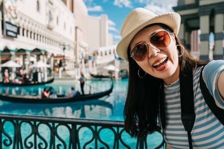 Traveler girl smiling at camera and make self photo with gondola on canal.
