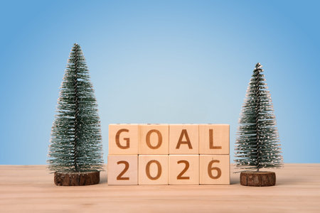 New Year 2026 and Christmas postcard. Wooden cubes with numbers 2026 and word goal and green Christmas trees on a wooden table and a blue background.