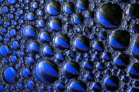 Ink foam. Bubble fluid flow. Defocused blue purple color oil texture emulsion liquid wave on dark abstract art background.