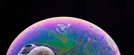 Blurred colourful soap bubble close up on black background. Creative background. Concept of space and creativity. Imitation of an unknown planet.