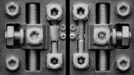 two rows of large bolts and nuts, integral for securing bridge metal structures, symbolizing strength, durability, and engineering precision.