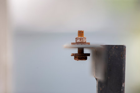 Close-up image of rusty bolts on metal beams showcasing intricate details of corrosion and weathered textures in an industrial setting.