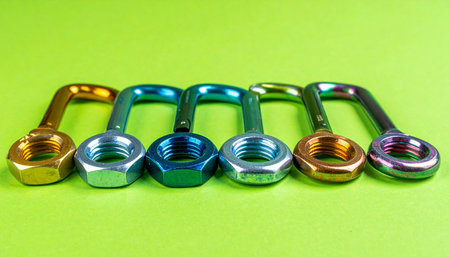 A vibrant lineup of assorted colorful climbing hangers stands ready against a bright green background. This essential safety equipment symbolizes preparation, strength, and the diverse paths of adventure, each piece a crucial link in the chain of a climbers ascent.