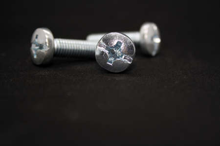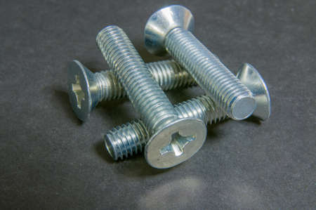 Silvery four bolts and pile screws on grey. Left upright bolt right light.