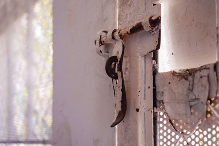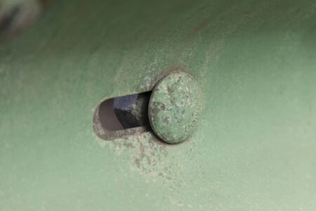 This close-up image showcases a rusty bolt embedded in a weathered metal surface, emphasizing the textures and colors of decay in industrial settings.