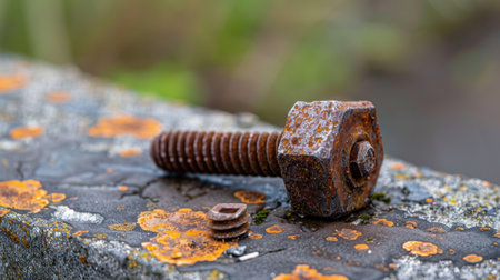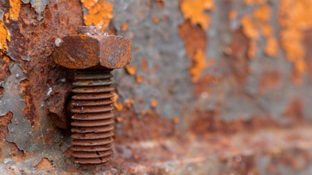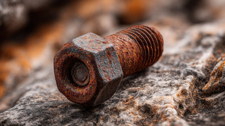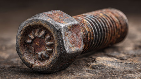 A close-up image of a rusty bolt showcasing detailed textures and wear on a rough surface, ideal for industrial and mechanical design concepts.