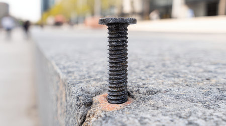 This close-up image showcases a rusty bolt fixed in concrete, capturing the textures and details of industrial design in an urban setting. Perfect for engineering visuals.