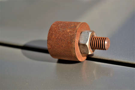 Rusted steel mile and hexagonal nut. Rusted metal exposed to corrosion with thread screw and hexagonal nut.