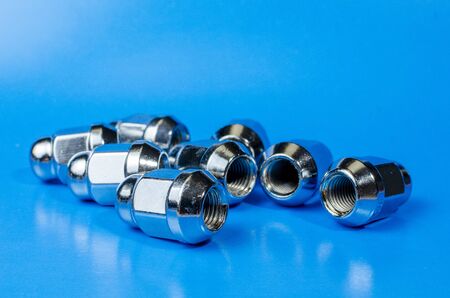 shiny metallic nuts to secure the wheel to a car on a blue background