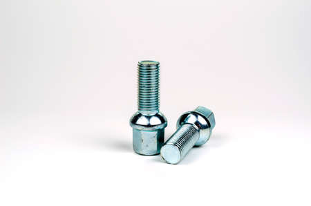 shiny metal bolts fastening a car wheel close-up on a white background. car spare part