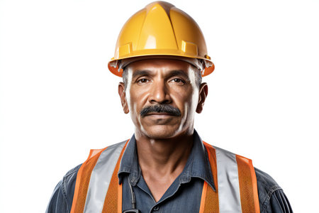 Close-up of an experienced construction worker with a yellow hard hat and stern expression
