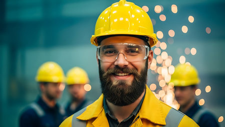 A close-up portrait of a confident bearded industrial worker wearing a yellow hard hat and safety glasses, smiling brightly at the camera. The background features blurred colleagues and sparkling lights from industrial activity.