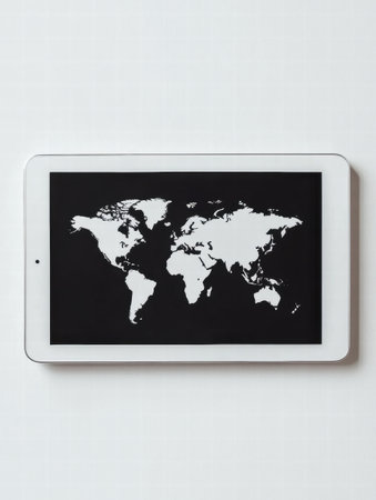 A modern flat lay featuring a tablet showing a world map against a clean white background, offering space for text and creativity.