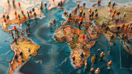A close-up image of a world map with miniature figures of people standing on different continents, symbolizing exploration, travel, and global connection.