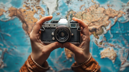 A person holds a camera in front of a vibrant world map, symbolizing the spirit of adventure and exploration. The image captures the essence of travel photography.