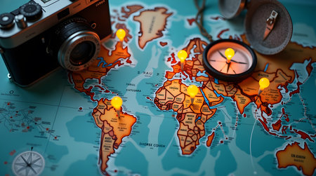 Inspiring global adventure planning with a vintage camera, compass, and illuminated map markers, photo concept