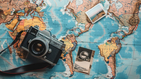 Travel memories captured with cameras on a world map background showcasing various destinations and adventures. Generative AI