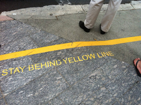 A high angle shot of a yellow line painted on the upper step of a staircase