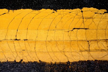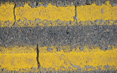 Black asphalt road texture with marking background. Horizontal double yellow line on asphalt road.