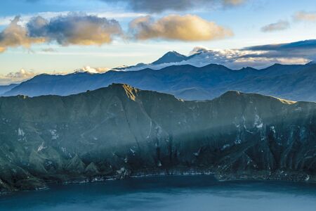 Quilotoa lake and andes range mountain against overcast cloudy background landscape scene, Ecuador