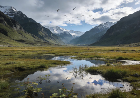 An AI generated illustration of A mountainous landscape with a snow-capped peak