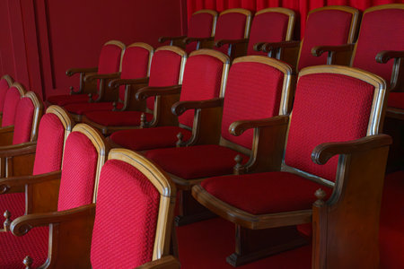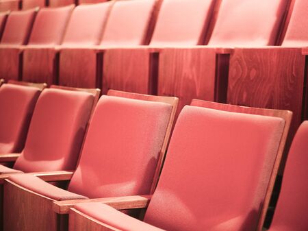 Empty rows of retro, old red theater or cinema seats. Old style, vintage chairs with red upholstery in concert hall.