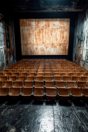 Rows of empty seats in an abandoned theater.
