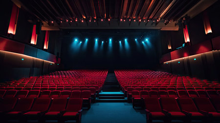 Captivating view of an empty cinema auditorium featuring rows of red seats illuminated by blue lights, creating a dramatic and inviting atmosphere perfect for cinematic experiences.
