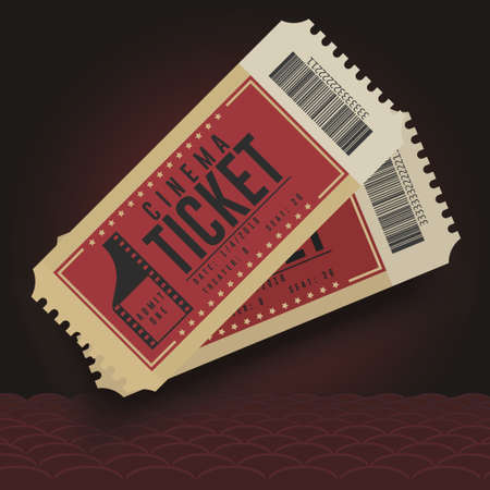 Cinema Tickets. Movie Cinema ticket icon, cardboard pair of tickets, entertainment show. Retro paper coupon on Theatre auditorium hall background with Rows of red seats. Theatre show premiere poster design. Vector