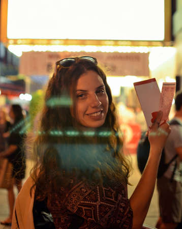 Man holding or showing two cinema tickets (Booking ticket concept)