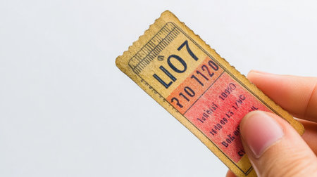 A close-up of a vintage ticket held in a hand, showcasing the faded colors and worn edges against a neutral background, evoking nostalgia.