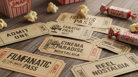 An overhead shot reveals an assortment of vintage-style cinema tickets and containers of popcorn and candy. Warm lighting illuminates the scene, highlighting the textures of paper, sweets, and wood. The composition suggests a nostalgic feel, potentially suitable for editorial content or commercial applications.