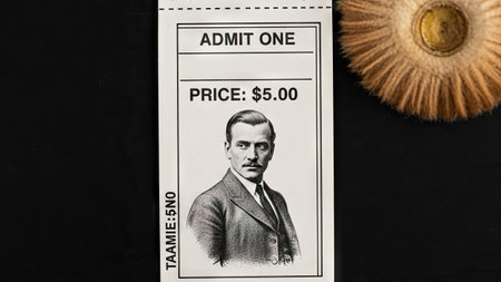 This image presents a vintage-style ticket labeled 'Admit One' with a $5.00 price. It features a distinguished portrait and a unique texture in a dark setting. The design suggests a retro aesthetic, suitable for various editorial and commercial applications.