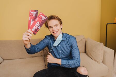 selective focus of happy man in medical mask holding night party tickets, end of quarantine concept