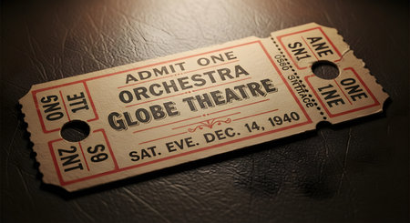 A close-up of an authentic-looking vintage orchestra ticket stub for the Globe Theatre, dated December 14, 1940. The aged paper and classic typography evoke nostalgia for a bygone era of entertainment and cinema.