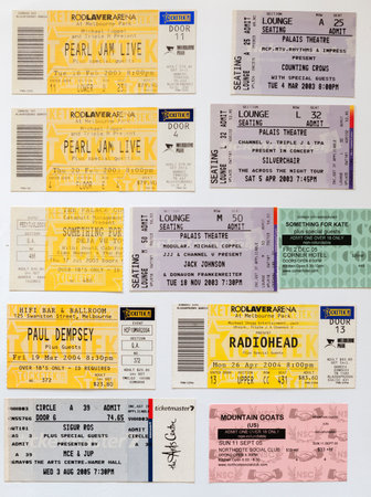 SOUTH AUSTRALIA, AUSTRALIA - AUGUST 8, 2014 - Concert tickets from world famous bands including Radiohead and Pearl Jam