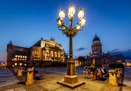 Panoramic view of famous Gendarmenmarkt square at sunset in Berlin Mitte district, Germany
