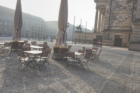 Dresden, Germany - June 28, 2022: Restaurants behind the Frauenkirche, with the the Augustiner, invite tourists to linger in a historical setting. The cityscape of the old town is constantly changing