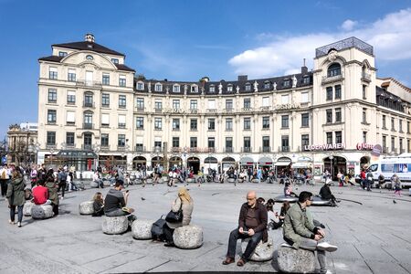 Germany, Bavaria, Munich, Stachus, Karlsplatz: Street scene with people men women of all generations ages sexes relax at the Karl's square in the center of the capital of Bavaria. April 22, 2016