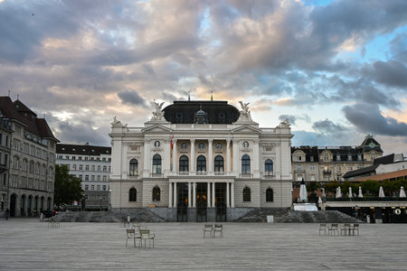 ZURICH, SWITZERLAND - SEPTEMBER 16, 2021. Zurich Opera House on the Sechselaeutenplatz square. City of Zurich, Switzerland, Europe.